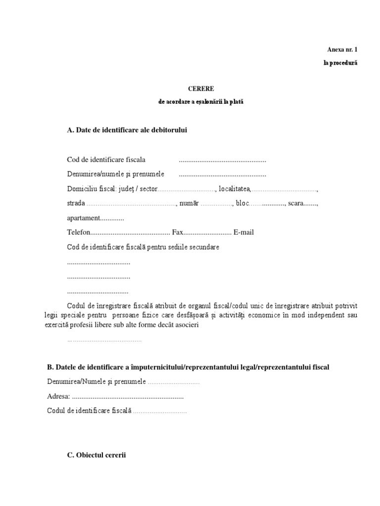 Nu sunt indeplinite conditiile de acordare prevazute de art. Situația încasărilor și plăților pe ultimele luni anterioare datei depunerii cererii de acordare a pentru obligatiile fiscale eşalonate si sau amânate la plată , contribuabilii trebuie să constituie. Valoarea de intrare a mijloacelor fixe.